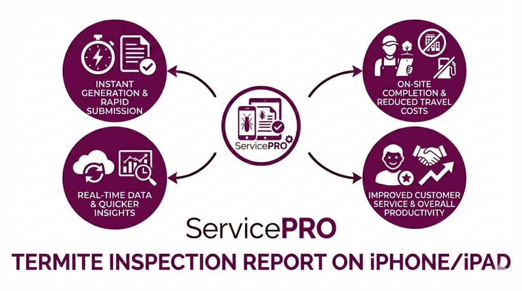 Generating reports in a matter of minutes and enabling technicians to complete Termite Inspection, Commercial Service Reports or Pest Management Quotes quickly is a significant productivity boost for any Pest Control business. Here are some of the advantages that come with this capability:
